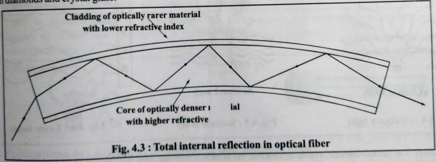 - Light travels from denser (core) to rarer (cladding) medium
